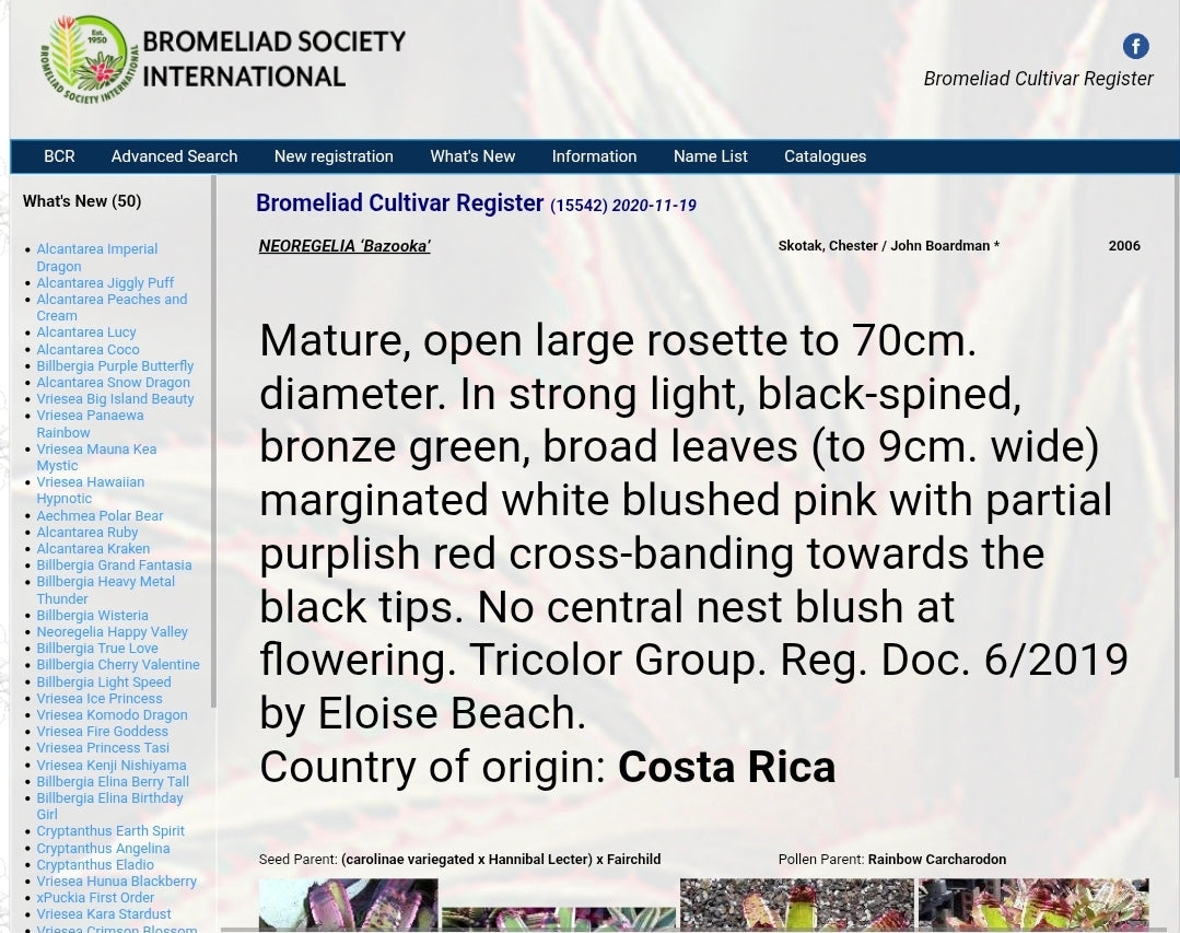 "Neoregelia Skotak Bazooka" se refiere a un cultivar específico de bromelia dentro del género Neoregelia, creado por Chester Skotak. Es una planta grande con hojas anchas de color verde bronce, márgenes blancos y rosa, y bandas cruzadas de color rojo púrpura parcial hacia las puntas negras. Cuando se cultiva bajo luz intensa, desarrolla un tinte rojo muy intenso y el Registro de Cultivares de Bromelias. No muestra un rubor central en la floración según el Registro de Cultivares de Bromelias.